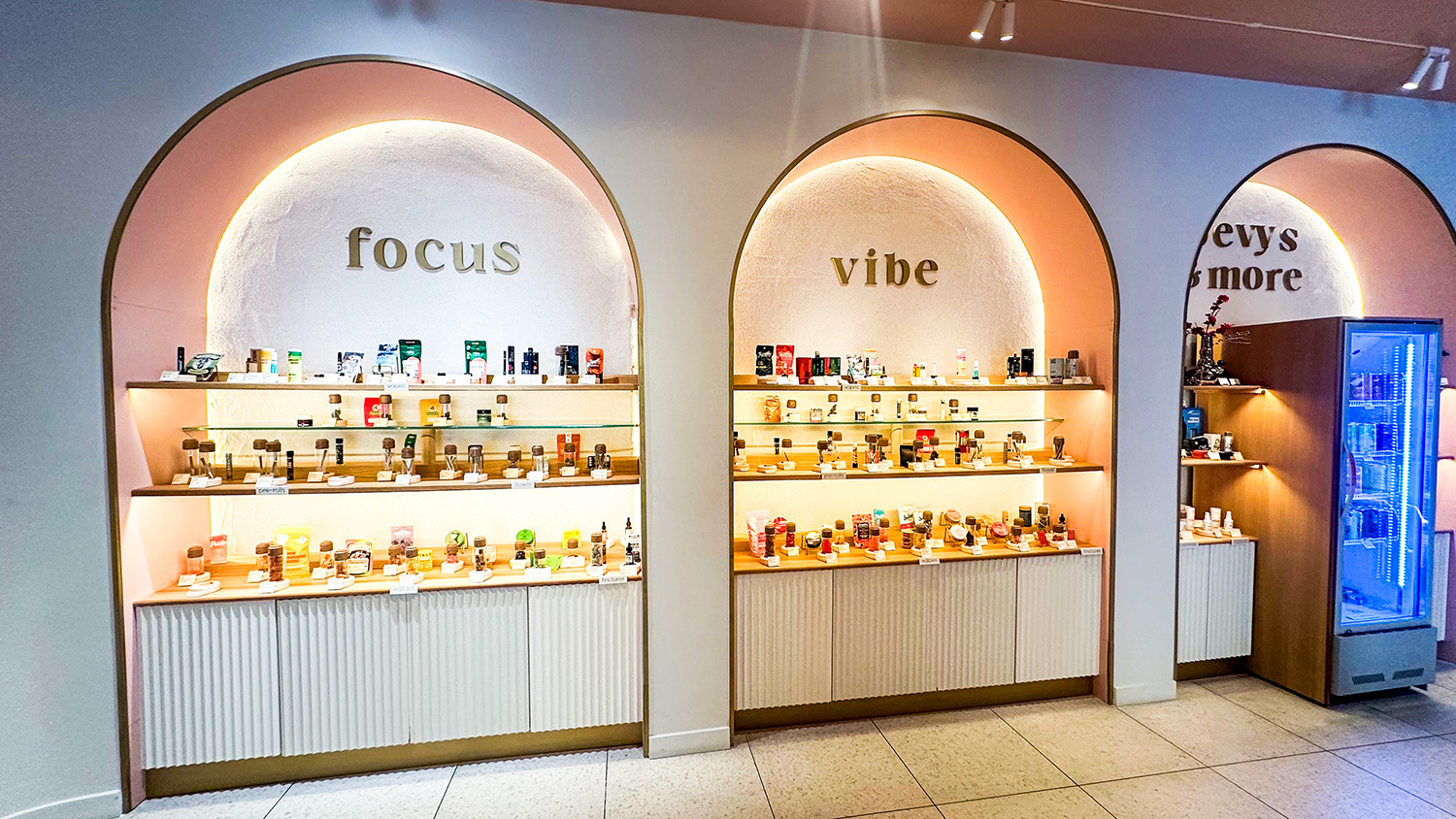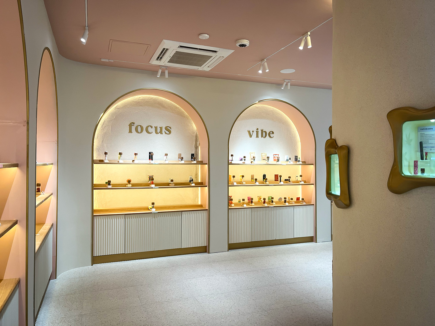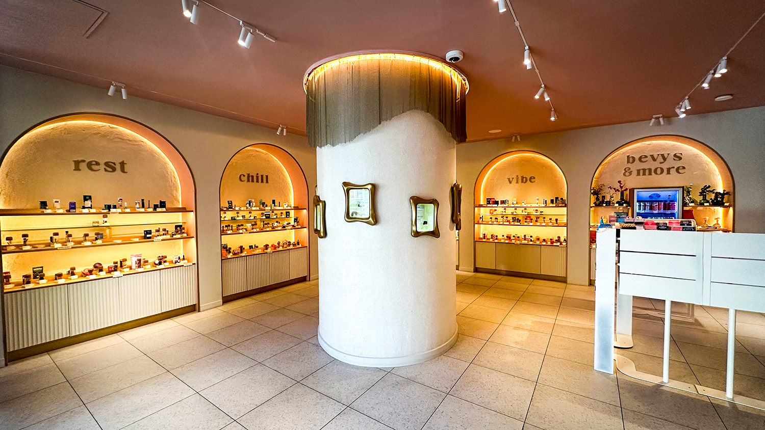 “I wanted to create something that I’d feel comfortable going to myself,” she said. “And I wanted visitors to feel like they could come in and interact with the products. I decided to arrange the store with five different arches, each representing [a different mood state]: sleep, chill, relief, focus, and vibe. I arranged products in indicas, hybrids, and sativas to really guide [the experience]. That way, people can come in and the flow just really clicks for them.”
