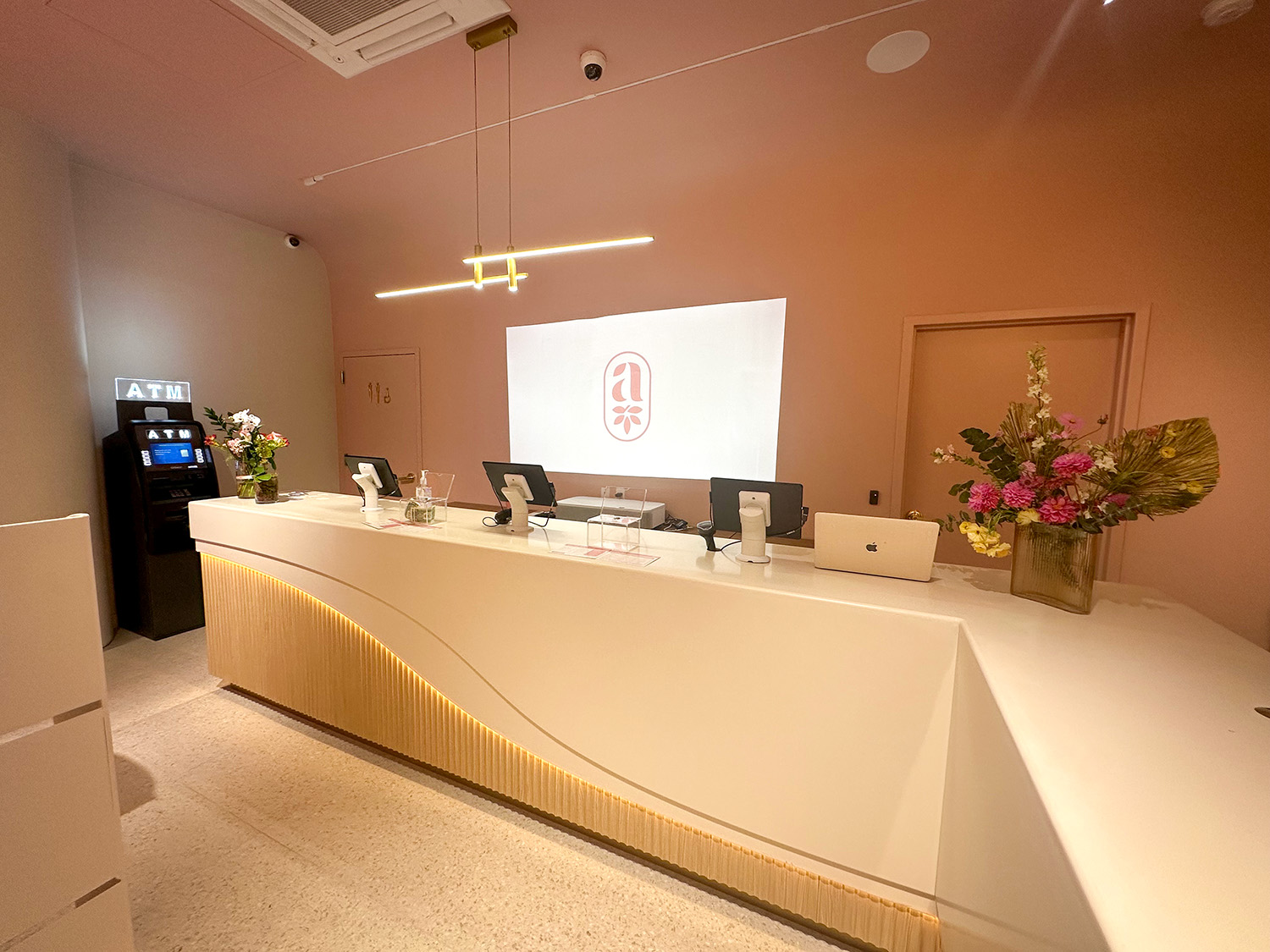 “I wanted arches, because that’s the trend right now. I wasn’t crazy about the pink at first, but as I developed [the plan], I said, ‘You know what? Let’s just go for it wholeheartedly,’” she said. “And I’m glad I did, because it has real customer appeal. They love the spa, the breathwork, the sound baths, and the meditation sessions we host. And despite the pink, we have tons of men coming in. I think some men appreciate it because they come in and they’re like, ‘Ah, it smells like a spa in here!’ For me, weed is like my glass of wine at the end of a long day, and I just wanted to share that calming experience with others.”