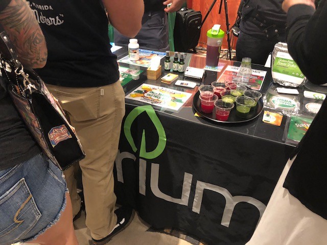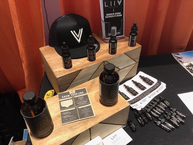Across the row, the LIIV Organics booth gave away samples of their mint-scented recovery hemp oil formula, and showed off an upcoming product from their line–CBD infused coffee. Near the busy end of an aisle, the booth saw a steady stream of show attendees, who took advantage of Saturday’s program.