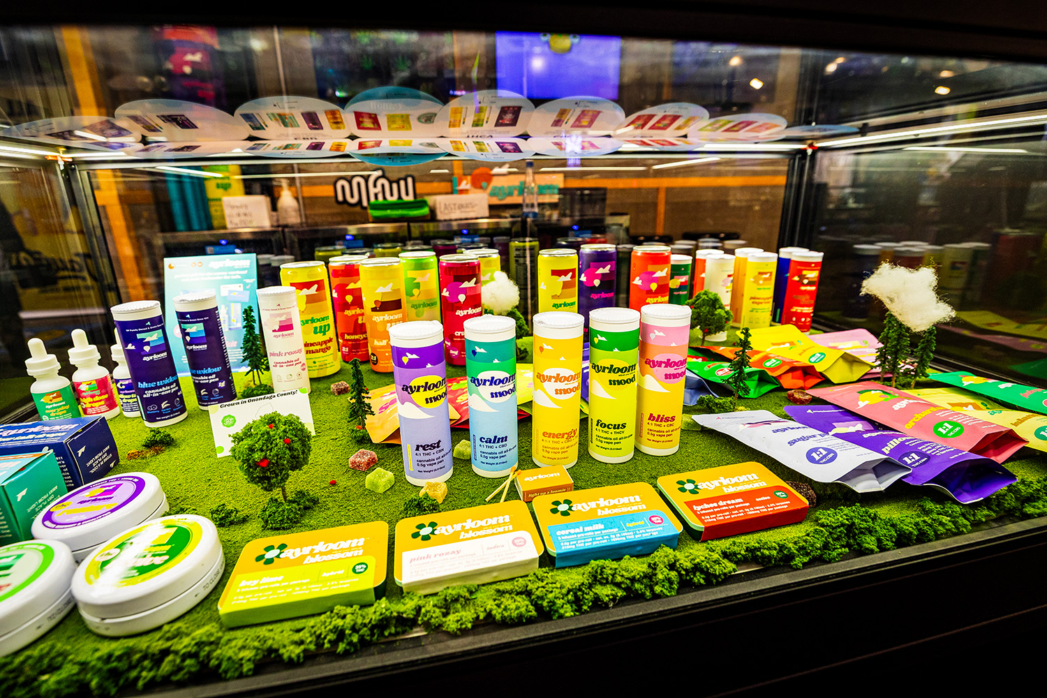 FlynnStoned’s immersive approach to retail is captured in this Ayrloom showcase, which combines vibrant packaging with creative visual merchandising. Display Dispensary’s modular case provides the perfect backdrop for Ayrloom’s colorful lineup and playful presentation.
