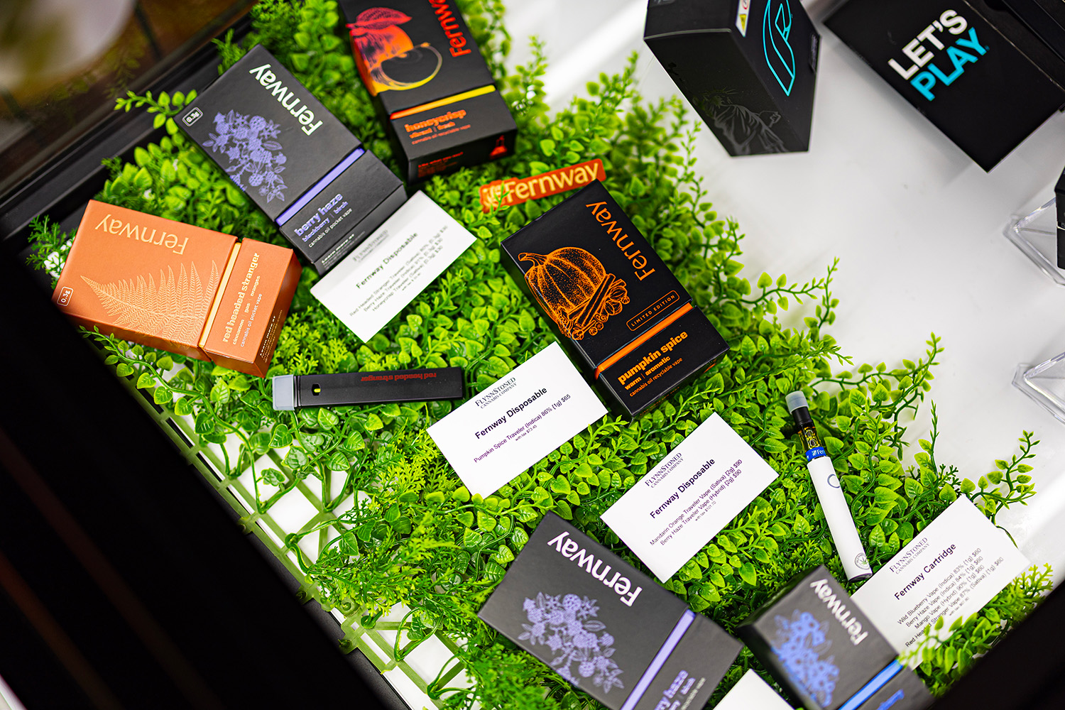 FlynnStoned’s merchandising approach allows brands like Fernway to shine with themed displays that enhance the product story. This tabletop garden-style setup elevates vape cartridge packaging while delivering clear product info for customer education.