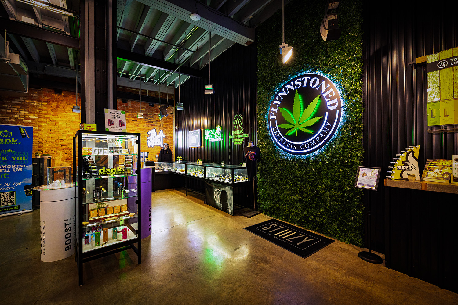 The main lobby at FlynnStoned Syracuse sets the tone for the elevated retail experience, combining industrial finishes with lush green wall accents and glowing branded signage. The integration of branded showcases and dynamic lighting draws customers into the premium dispensary experience.