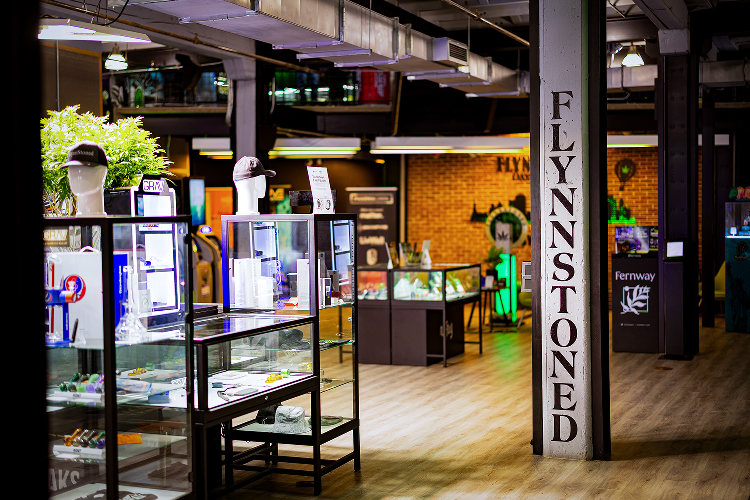 The retail floor at FlynnStoned Syracuse blends industrial elements with product-forward design. Showcases from brands like GRAV and Fernway are positioned throughout the space to encourage discovery, while the FlynnStoned brand identity is reinforced through signage and strategic interior branding.