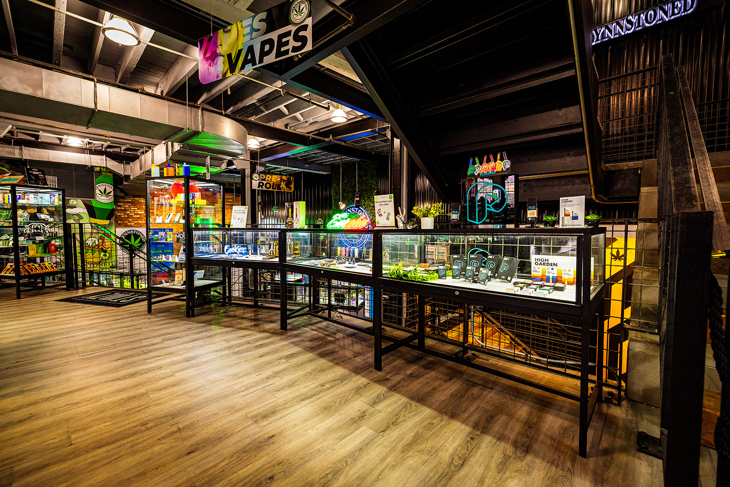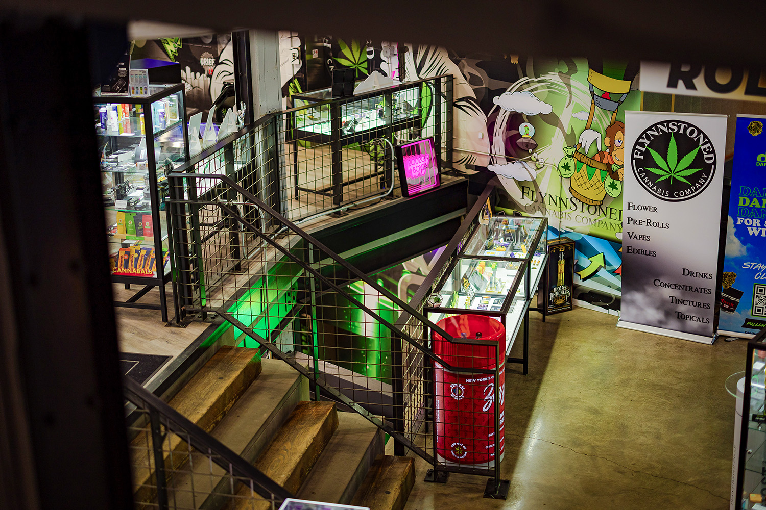 The FlynnStoned flagship uses every surface—including walls and stairwells—for immersive brand storytelling. Murals, banners, and colorful display cases enhance the visual journey and guide shoppers through the multilevel layout.