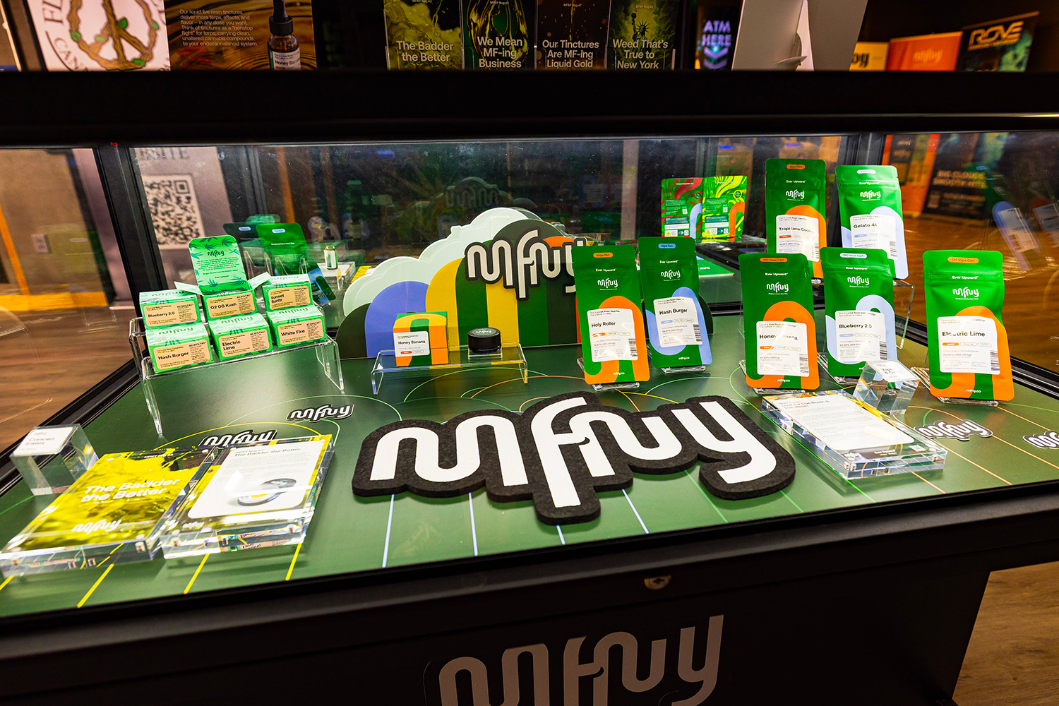 FlynnStoned’s flagship location in Syracuse features a standout MFNY product display with bold green packaging and modern presentation. This branded showcase, part of Display Dispensary’s modular layout, emphasizes product visibility and brand recognition through sleek merchandising and clean visual lines.