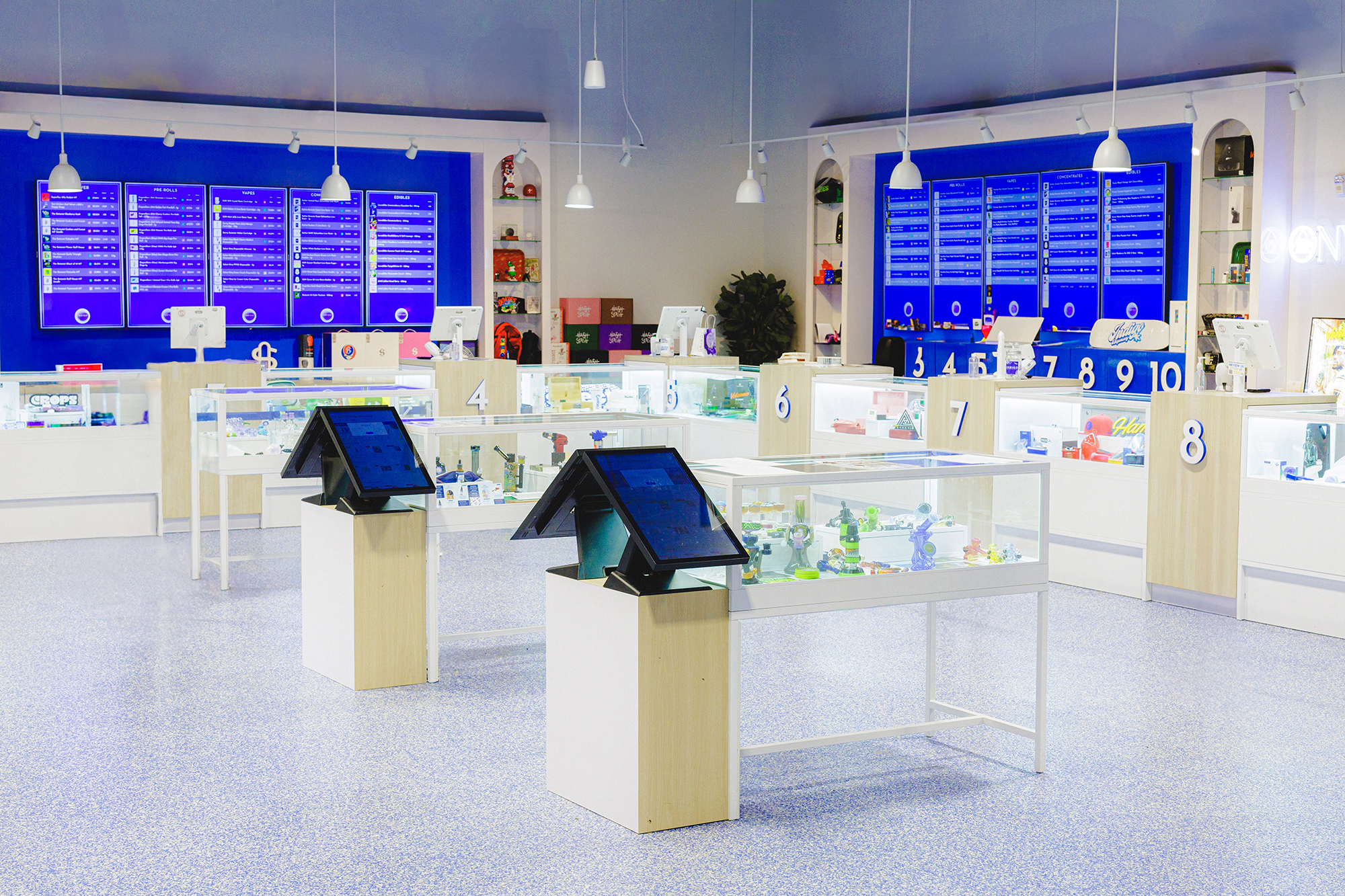 That efficiency comes without sacrificing build quality or design character. Ziegler wanted a youthful vibe and energy that would feel familiar and comfortable for visitors of all ages. To achieve the effect, Display Dispensary augmented Indigo’s bright, airy interior, branding, and striking color palette with white display cases, sales-floor fixtures, and drawers. The point-of-sale stations, iPad stands, and countertops are finished with raw-oak laminate, which Peterman called “very good for commercial use. It’s easily cleaned, doesn’t show fingerprints, and generally exemplifies all the things you want to see in a busy retail environment.”
