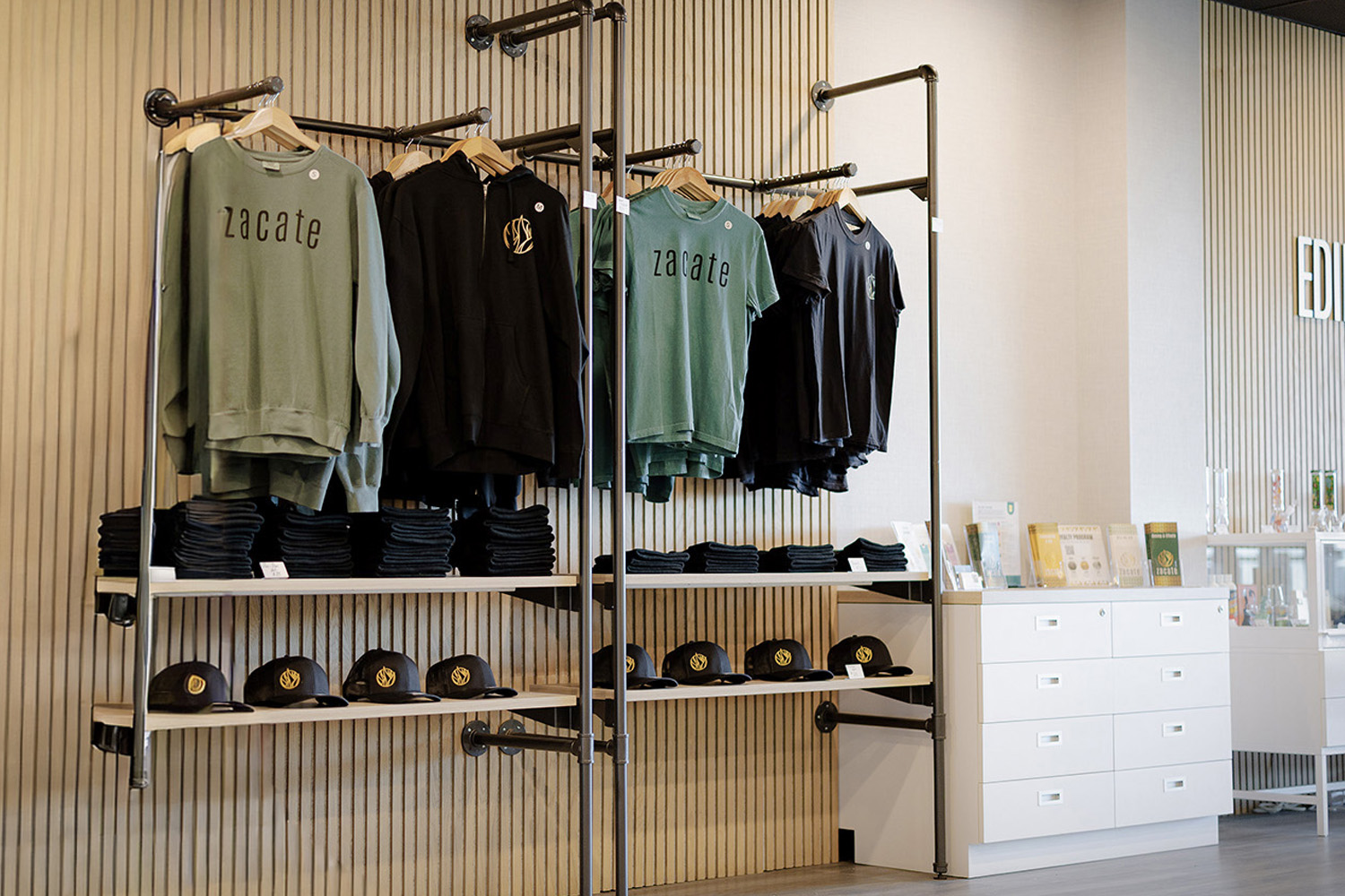 “We ended up customizing the islands specifically for Zacate’s layout, which gave them a unique and functional centerpiece that fit seamlessly into the store’s flow,” Sunga said. “We also helped with the concept and layout for the store’s ‘green wall’ and panel blinds, both of which add subtle texture and softness to the space without distracting from the product. Even though we didn’t produce those elements, collaborating on the visual direction helped tie everything together and keep the brand experience consistent.”